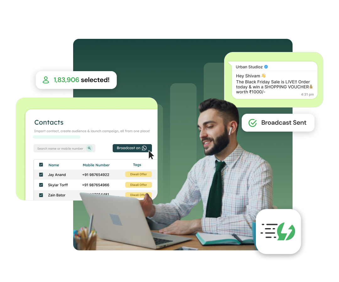 Simply import all your contacts and broadcast approved messages instantly โ whether it's holiday greetings or year-end offers.